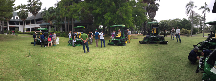 三天的培訓(xùn),時(shí)間安排緊湊有序,每天早晨七點(diǎn)準(zhǔn)時(shí)乘車出發(fā)去培訓(xùn)地點(diǎn)。前兩天培訓(xùn)安排在Lakewood高爾夫球場(chǎng),最后一天的服務(wù)培訓(xùn)則安排在迪爾培訓(xùn)中心。首先從A系列最先進(jìn)技術(shù)Tech-control系統(tǒng)開始模擬操作學(xué)習(xí),通過(guò)顯示屏操控、設(shè)定、了解整車的運(yùn)行、剪草、維修、診斷等功能。Tech-control可視界面,具備指尖控制功能,不僅有助于實(shí)現(xiàn)出色的剪草效果,還可提高機(jī)器的工作效率。然后我們分組圍繞機(jī)器,進(jìn)行最直觀的實(shí)機(jī)學(xué)習(xí)和討論,在輔導(dǎo)老師的提示下,識(shí)別并列出每款A(yù)系列機(jī)器的新增功能、改進(jìn)及變化之處。之后老師通過(guò)一張張機(jī)器部位卡片和實(shí)際部件,清晰明了地講解每個(gè)機(jī)型的每個(gè)改進(jìn)部位,不僅讓銷售人員們對(duì)機(jī)器的部件有更加清楚地認(rèn)知,而且對(duì)部件的位置、形狀和區(qū)別,都有了深刻的印象,值得我們學(xué)習(xí)借鑒。最后根據(jù)這兩天的學(xué)習(xí),每個(gè)人都親自上車實(shí)機(jī)演示,上車前設(shè)置好剪草、運(yùn)輸、轉(zhuǎn)彎速度,手指輕按Tech-control操作平臺(tái)按鈕,即可感受自動(dòng)巡航功能帶來(lái)的前所未有的操作員感受。通過(guò)課堂理論的學(xué)習(xí),以及室外場(chǎng)地的實(shí)機(jī)操作,使我們對(duì)A系列的新產(chǎn)品了解的更加透徹。在總結(jié)會(huì)上,老師準(zhǔn)備了很多A系列新功能的小標(biāo)題,通過(guò)游戲傳球的方式,讓大家利用小標(biāo)題展開話題進(jìn)行講解,課堂氣氛生動(dòng)活潑,學(xué)員參與話題積極踴躍,而李國(guó)強(qiáng)對(duì)7200A在球場(chǎng)意外停機(jī)處理辦法的細(xì)致全面的講解,贏得了學(xué)員們熱烈的掌聲。