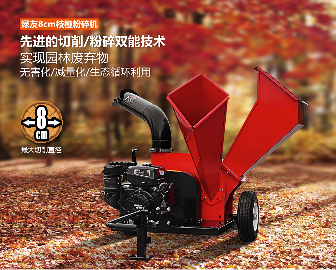 綠友小粉碎機是一款徑向進料系統的商用小型粉碎機,其寬大的粉碎進料口可同時送入大量的細小枝椏,重力切削進料口最大可切削8cm的樹枝,360度旋轉出料口更方便收集及清理。