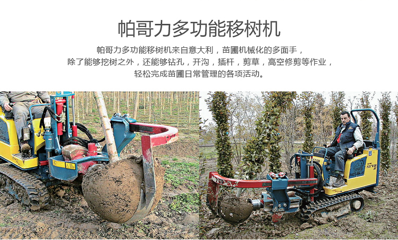 來自意大利的帕哥力多功能移樹機(jī),是苗圃機(jī)械化的多面手,除了能夠挖樹之外,還能夠鉆孔,開溝