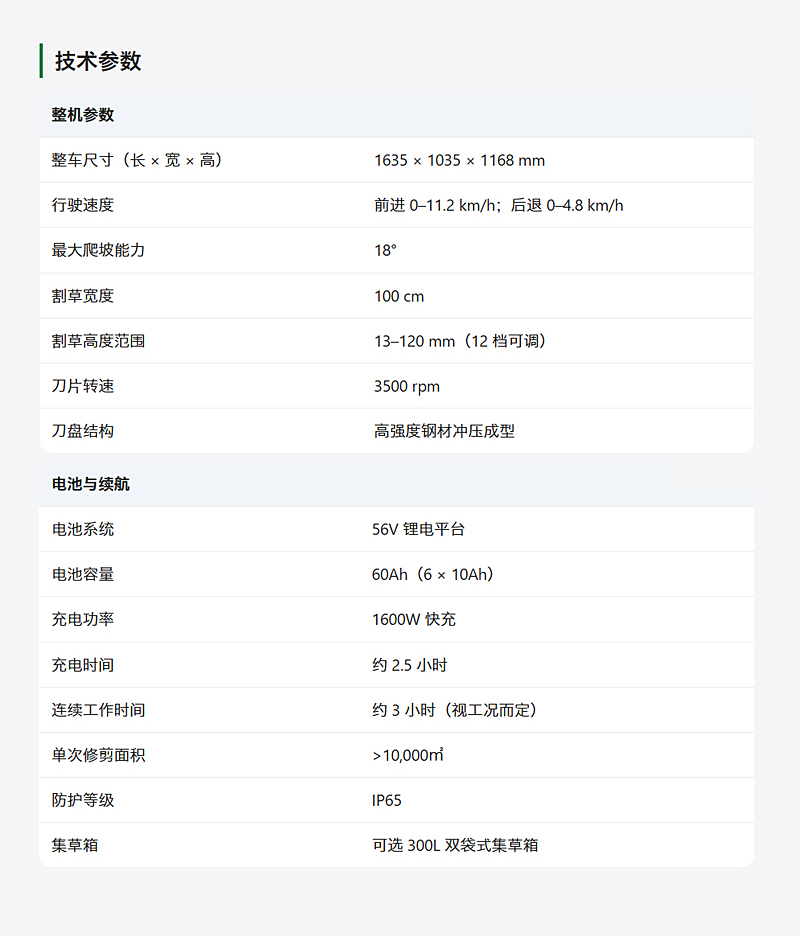 - ● 長(zhǎng)效續(xù)航能力:60Ah 大容量電池平臺(tái),2.5 小時(shí)快充,單次修剪面積可超過(guò) 10,000㎡。