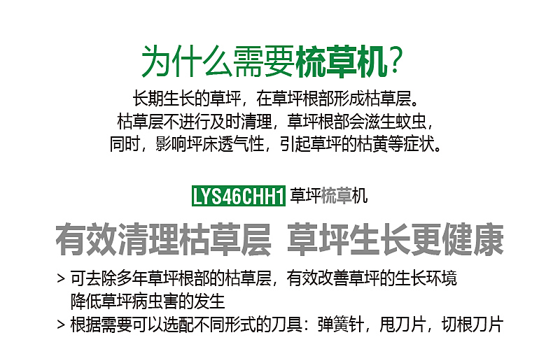 草坪生長(zhǎng)一段時(shí)間后,底部會(huì)結(jié)出一層枯草層,時(shí)間一長(zhǎng),不參加光合作用,會(huì)霉變腐爛,滋生霉菌,阻礙土壤吸收氧份,導(dǎo)致草坪枯萎,使草坪生長(zhǎng)不良,草坪很難看,這時(shí)噴灑藥物,不能治本,應(yīng)將枯草清除。梳草機(jī)就很省事的能把枯草去除。