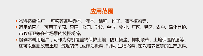 適用范圍廣,可用于苗圃、果園、公園、學校、單位、物業(yè)、廠區(qū)、景區(qū)、農(nóng)戶、綠化養(yǎng)護、市政環(huán)衛(wèi)等多種場景枝椏粉碎,最大粉碎直徑10cm。